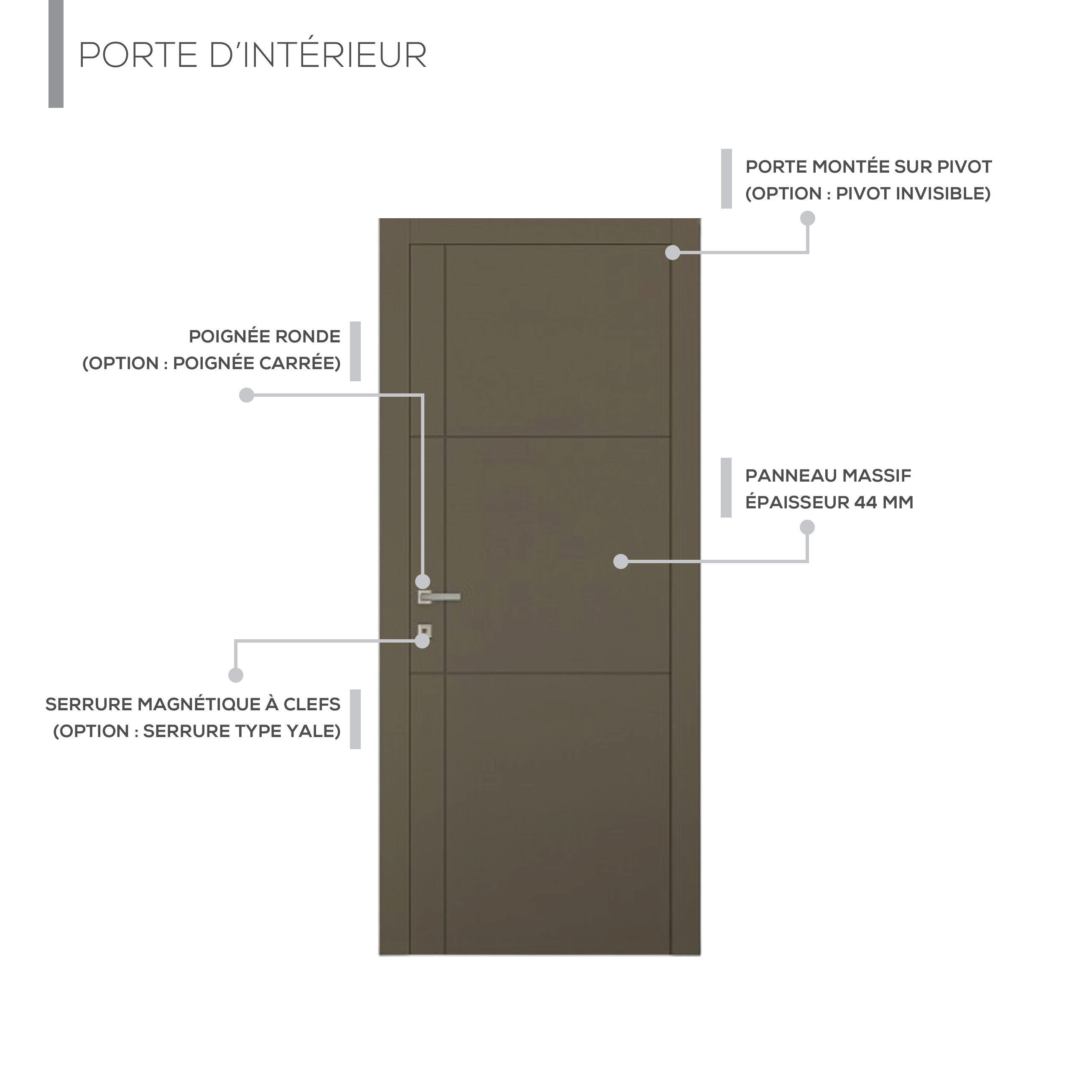 Cette porte battante pleine séduit par son style moderne et élégant. Ses panneaux soulignés par des lignes horizontales et verticales discrètes apportent une touche graphique tout en restant sobres, pour une intégration harmonieuse dans tous types d’intérieurs.