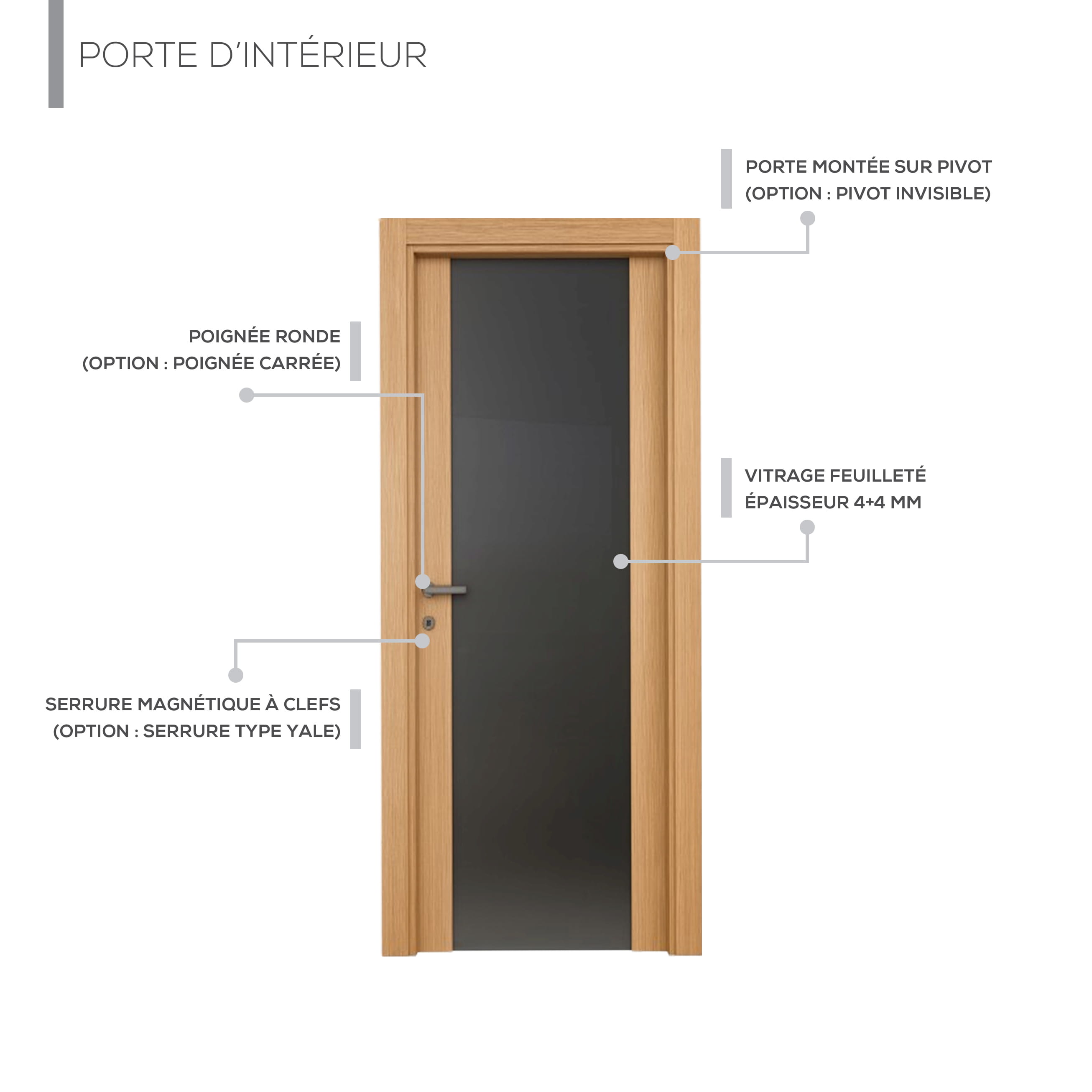 Cette porte battante vitrée associe la chaleur du cadre en bois à la modernité d’une grande vitre teintée. Elle permet de laisser passer la lumière tout en préservant l’intimité grâce au vitrage sombre, idéal pour les pièces de vie comme pour un bureau ou un couloir.
