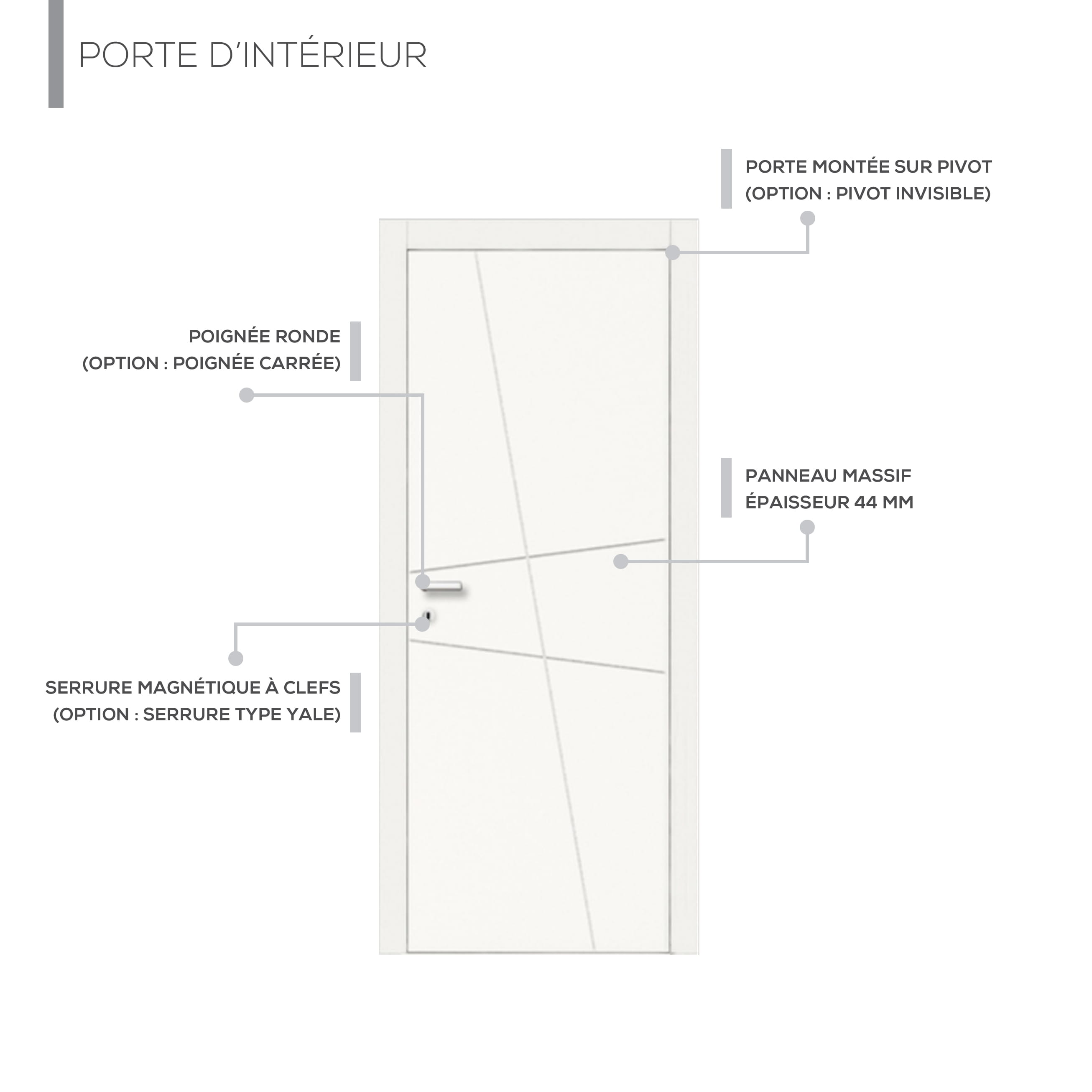 Sa finition illumine vos pièces et s’harmonise facilement avec tous les styles d’intérieur : moderne, scandinave ou minimaliste. La poignée métallique droite renforce le caractère actuel de la porte et assure un usage confortable au quotidien.