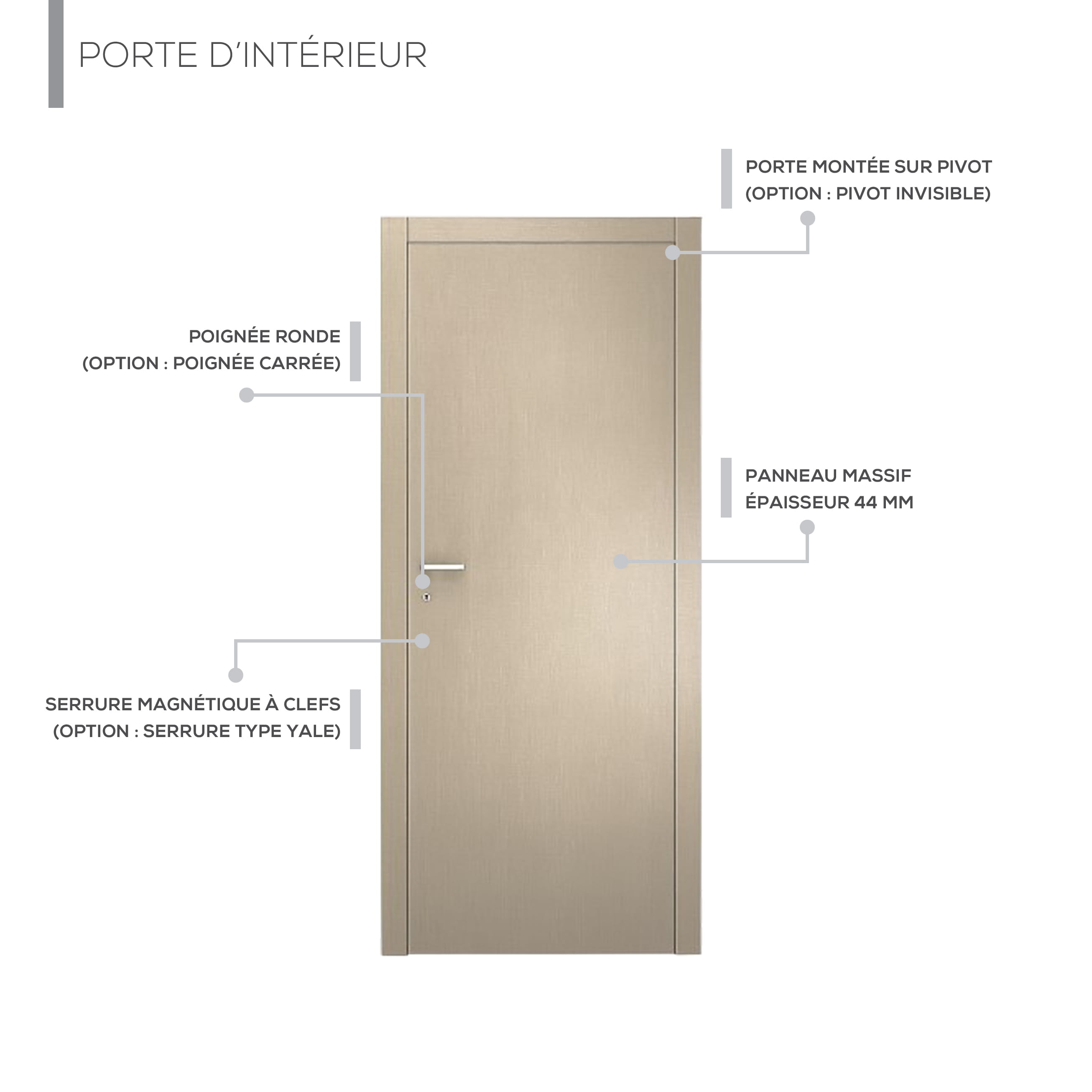 La poignée métallique droite apporte une touche design et assure une prise en main confortable au quotidien. Grâce à son esthétique sobre, cette porte s’accorde aisément avec différents revêtements muraux et sols.