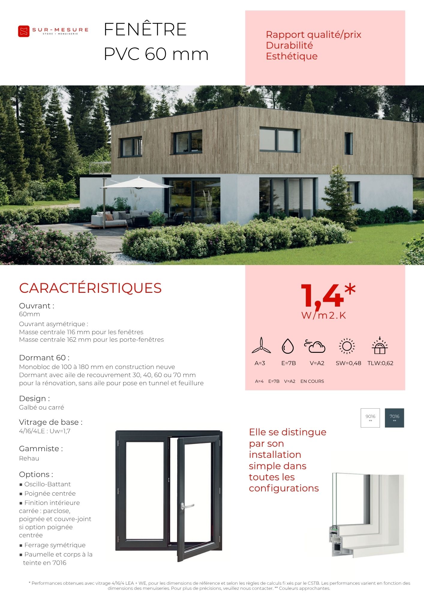 - Performance Thermique : Ug = 1.4** (valeur du vitrage) / Uw = 1.7 (valeur de l'ensemble de la fenêtre).