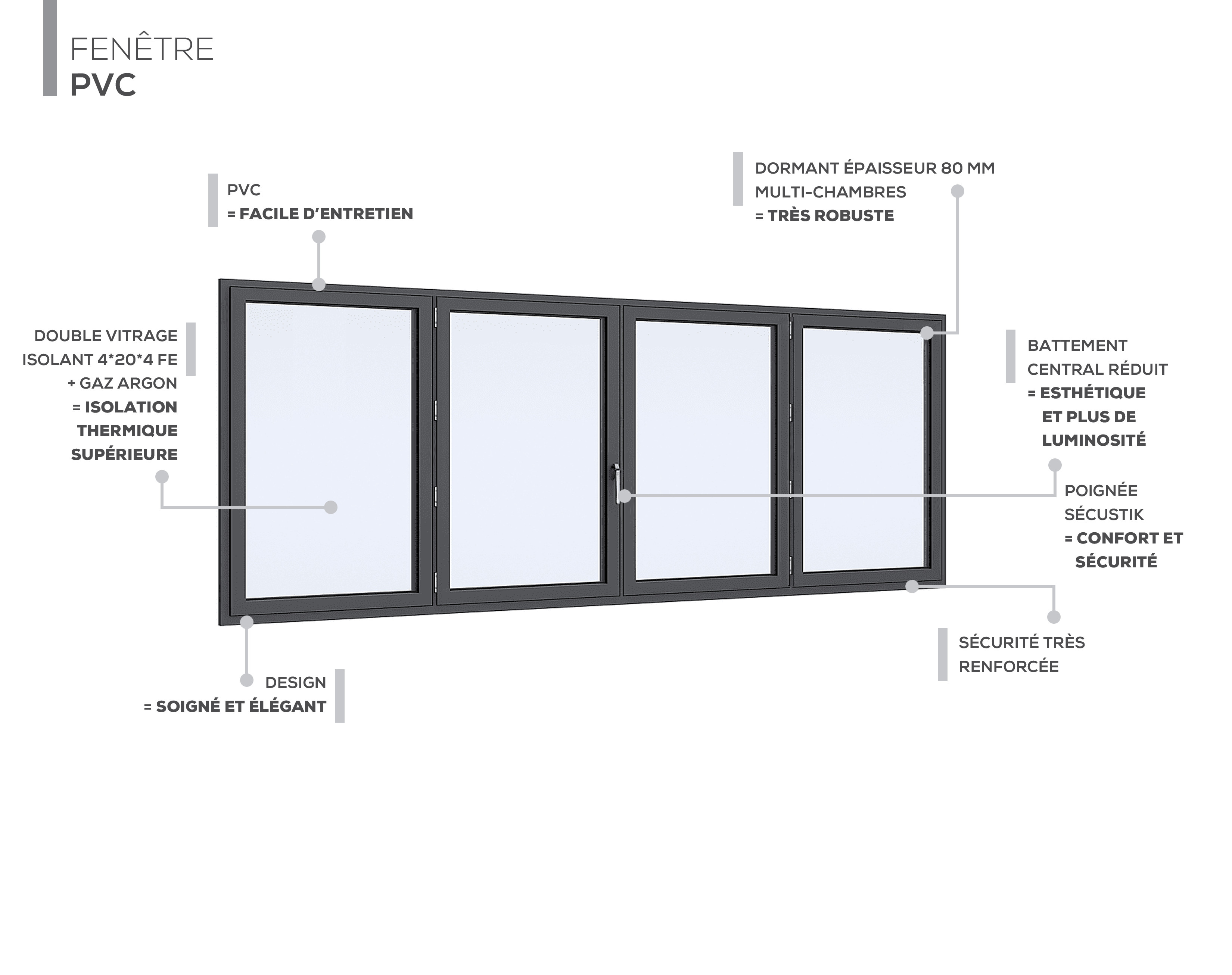 Disponible en plusieurs configurations, cette fenêtre PVC peut être personnalisée pour répondre à vos besoins spécifiques, tout en maintenant une performance thermique et acoustique optimisée.