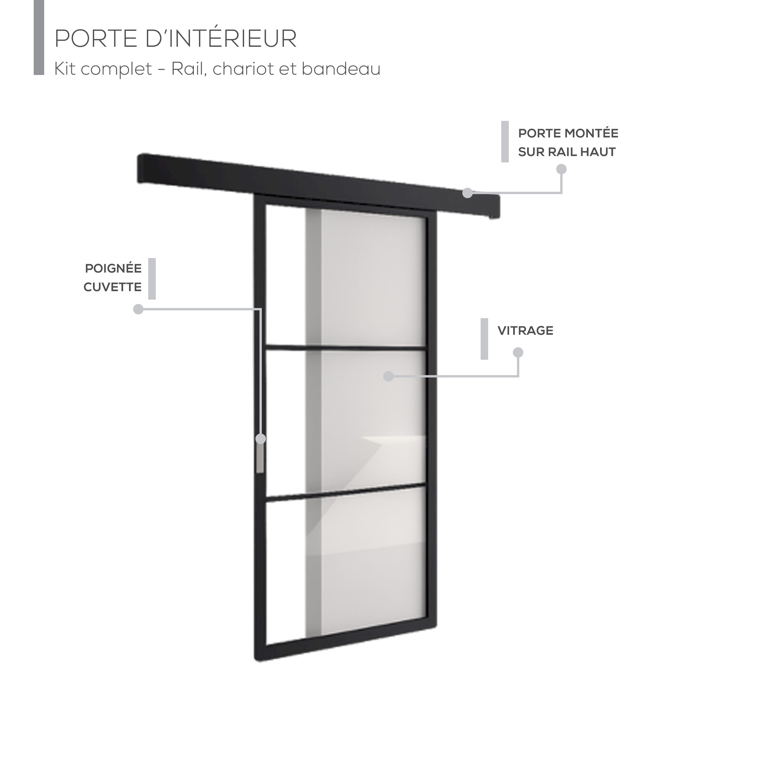 Son système de coulissage à rail extérieur assure une ouverture fluide, idéal pour gagner de la place par rapport à une porte battante. La pose avec bandeau en applique permet de dissimuler le rail pour un rendu esthétique, épuré et contemporain.
