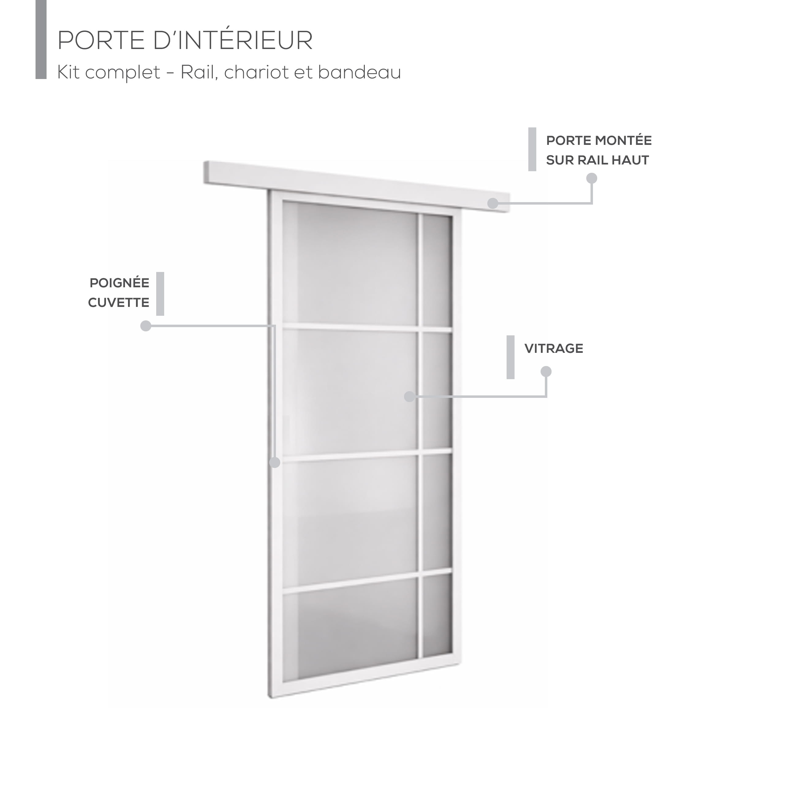 Installée sur rail extérieur avec bandeau en applique, elle offre une ouverture fluide et silencieuse tout en masquant le mécanisme pour une finition soignée. La poignée encastrée garantit un usage confortable et discret, idéale pour optimiser l’encombrement.