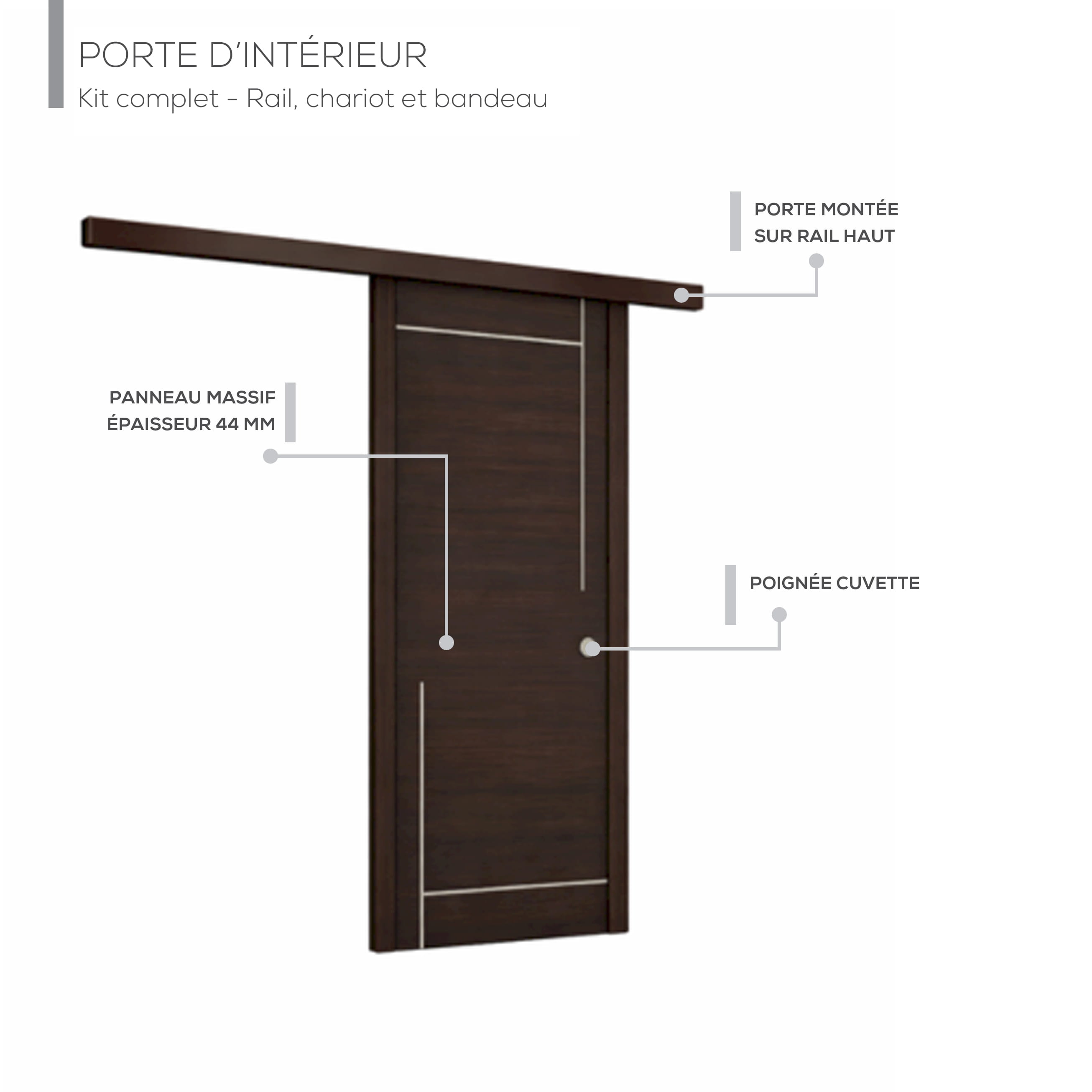 Montée sur rail extérieur avec bandeau en applique, elle assure une ouverture fluide tout en dissimulant le mécanisme pour un rendu esthétique et soigné. Grâce à sa poignée encastrée, la porte conserve une surface plane et épurée, parfaite pour les espaces restreints.